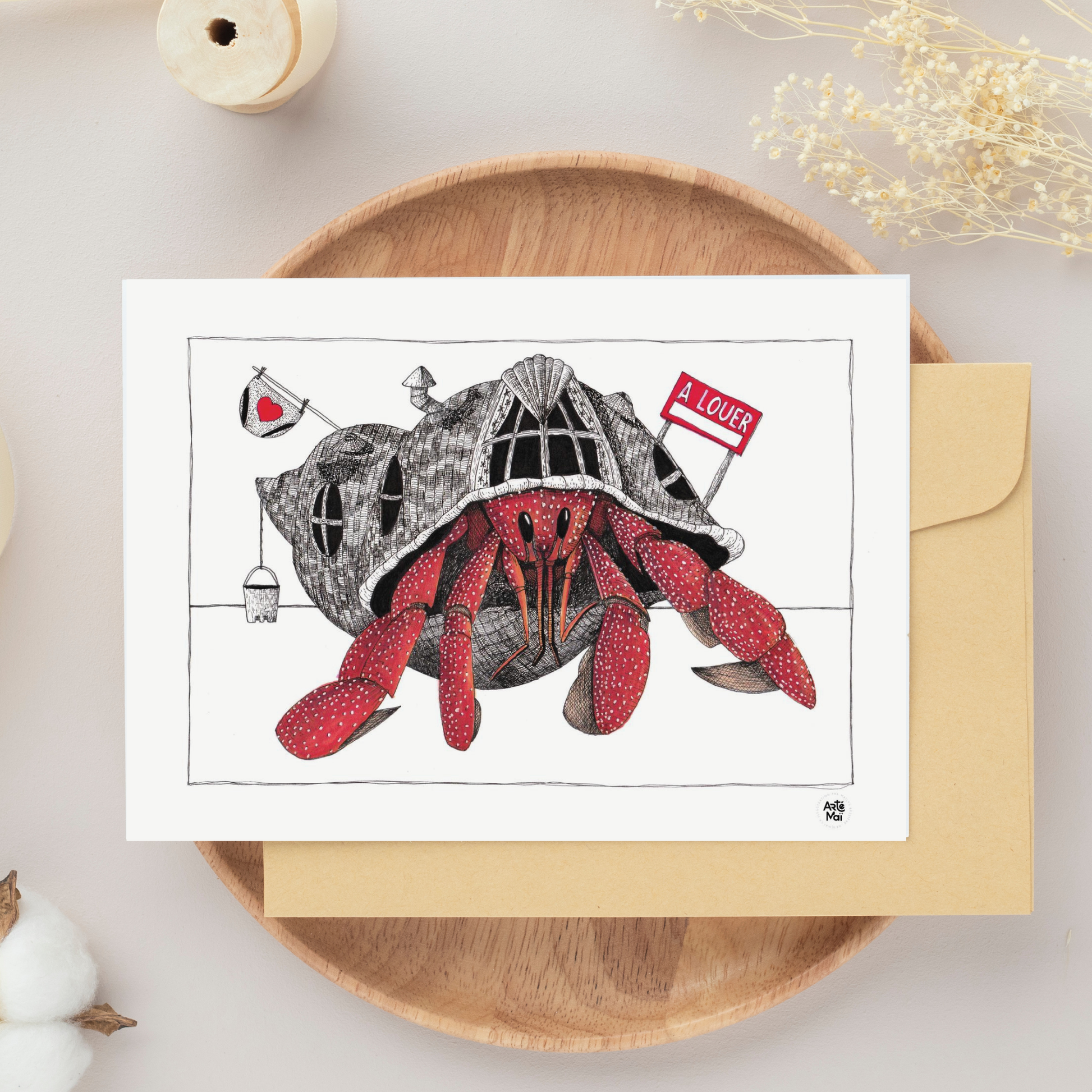 Carte de souhait représentant Bernard l'hermite louant sa maison. Cette illustration amusante réalisée à la main, est parfaite pour envoyer des vœux légers et joyeux. Que ce soit pour une pendaison de crémaillère, ou simplement pour faire sourire vos proches.
