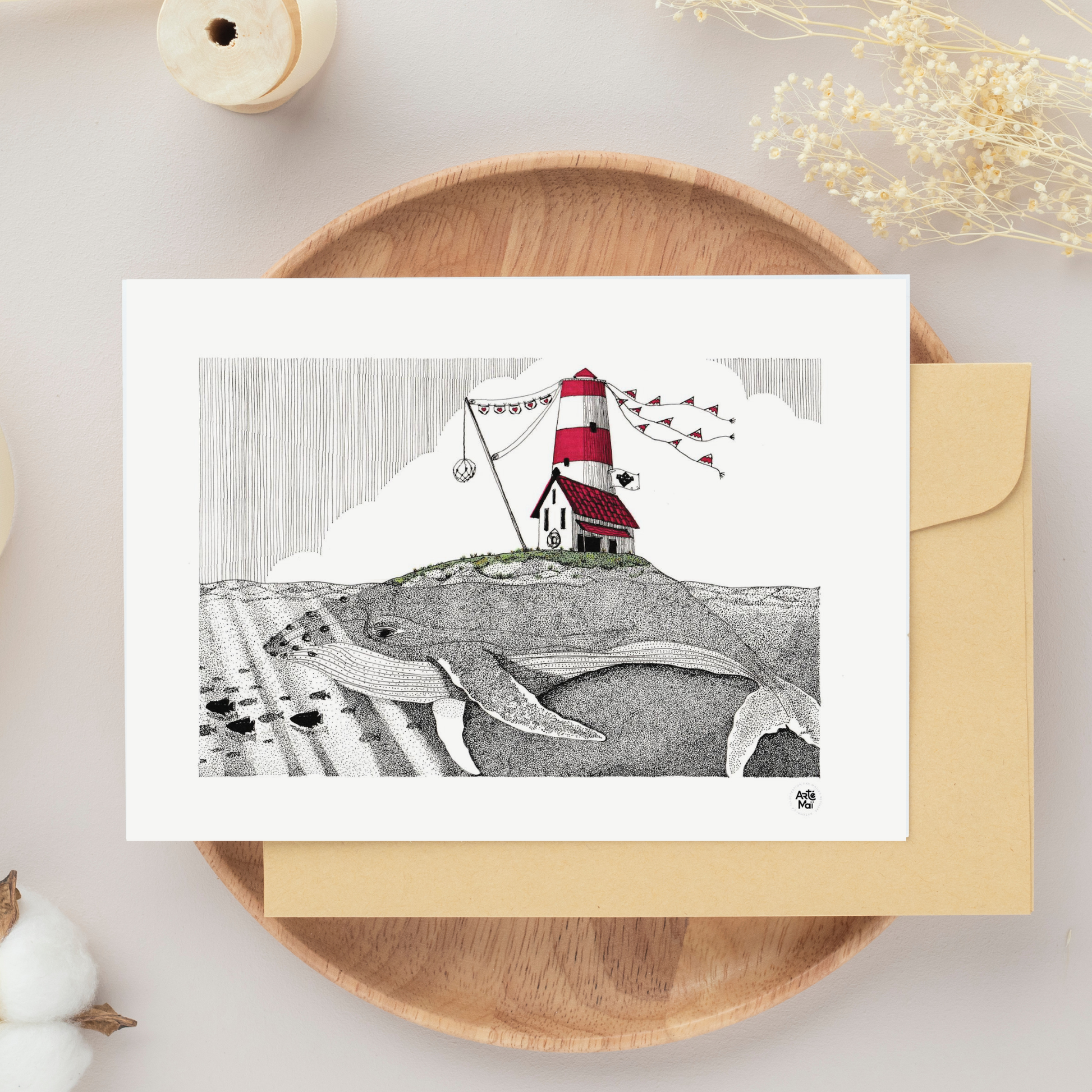 Carte de souhait, représentant une baleine majestueuse portant un phare sur son dos. Cette illustration imaginative et captivante, réalisée à la main, est parfaite pour envoyer des vœux pleins de poésie et d'originalité. Que ce soit pour célébrer un moment spécial, encourager un ami ou simplement pour apporter une touche de magie à une journée ordinaire, cette carte saura émerveiller vos proches. Inspirée par mes voyage sur la Côte-Nord ou en Gaspésie au Québec.